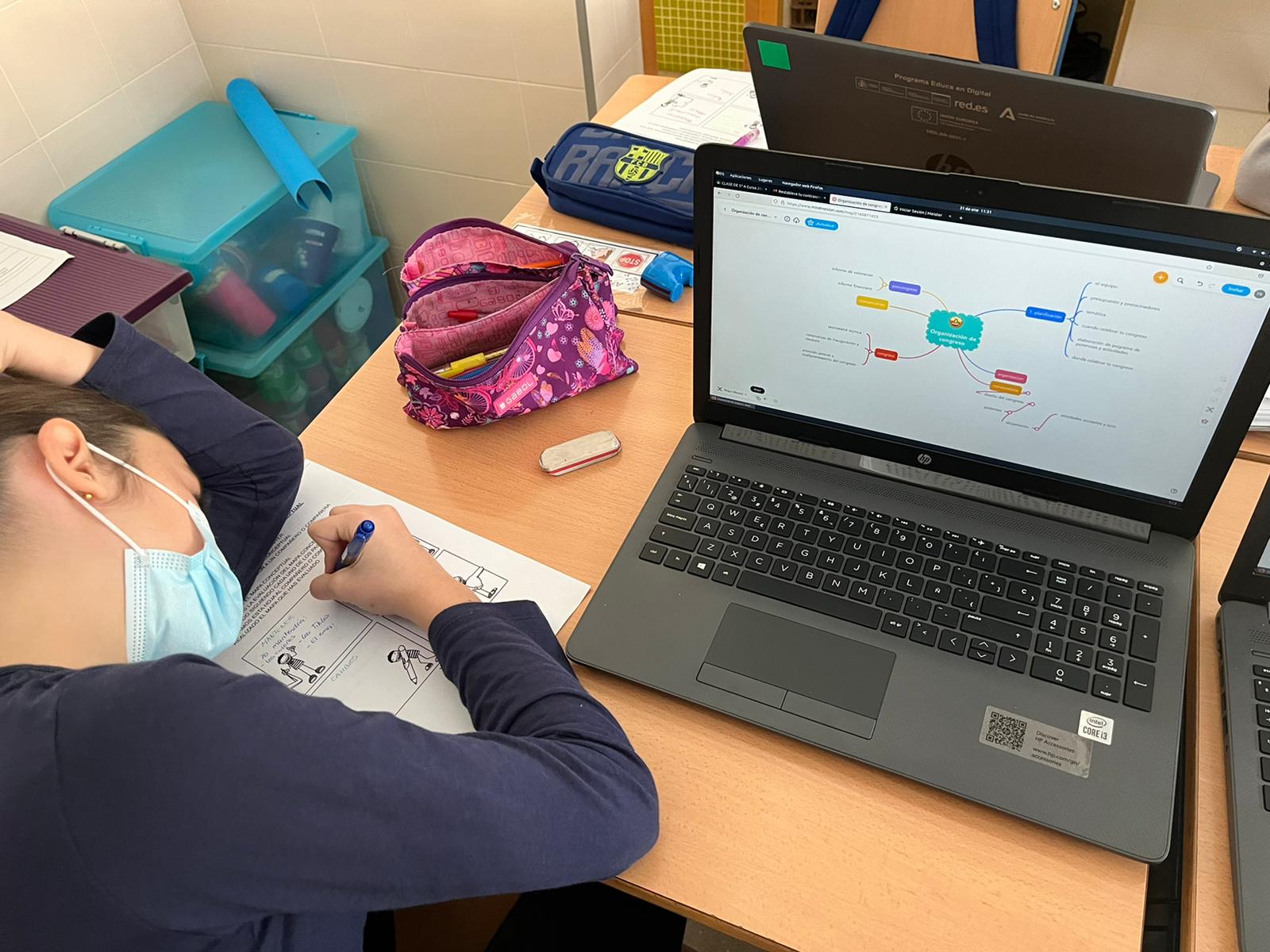 Sesión 4: El paso siguiente ha sido lanzarnos a realizarlo en formato digital, utilizando la página mindmeister dónde han podido trasladar el primer borrador de su mapa conceptual elaborado en formato papel, incorporando las propuestas de mejora trabajadas en la sesión anterior. Esto nos ha llevado dos sesiones de trabajo, donde el nivel de concentración ha sido bastante alto y las producciones realizadas muy interesantes.